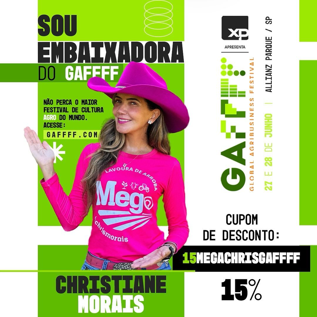 O MEGA MAIOR Festival, Fórum e Cultura AGRO do Mundo ! Também ao lado de outras MEGA Embaixadoras, estou pelo meu projeto a produção da intensificação da recria e engorda, na pecuária de corte e couro sustentável e multi certificada @megalavouradearroba sou multi certificada: “Certificada no CAR com excedente ambiental pelo soberano “Código Florestal Brasileiro”; também a certificação do PRIMI, onde a rastreabilidade de cada animal inclusive os indiretos, para exportação da carne e couro bovino sustentável e rastreado. MEGA empolgada em convidar todos vocês para o maior festival de cultura agro do mundo, que acontecerá nos dias 27 e 28 de junho, no @allianzparque em São Paulo – SP!