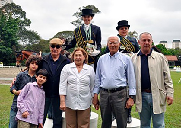 O pódio do Brasileiro de Amador: Chris Morais comemora o título com seus pais (ao centro) e a vice-campeã Nicole Abdo, acompanhadas pelos anfitriões Francisco Leite, presidente da Hípica Paulista, e Arthur Caruso, vice